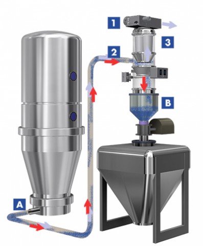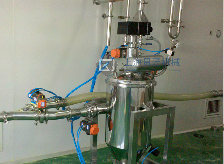 在A、B兩種情況下,輸送過程必須采用氮氣保護。輸送過程中因為摩擦易產生靜電引起危險,A狀況一般很難碰到。因為絕大多數物質的起爆能MIE>3mJ。對于C狀況,物料在分離倉時需要經過特殊處理,物料到達分離倉將要卸料前,吸料口通過一個閥門可自動關閉。然后反吹氣囊吹入惰性氣體保證安全,并使其壓力達到平衡。然后物料即可進入所有輸送場所。